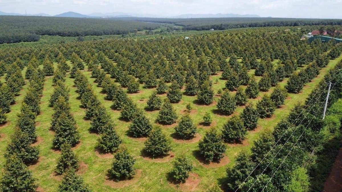 Thảm cỏ của trang trại sầu riêng Thanh Sang vừa được cắt để chuẩn bị cho mùa mưa tới. Ảnh: Lê ngọc.